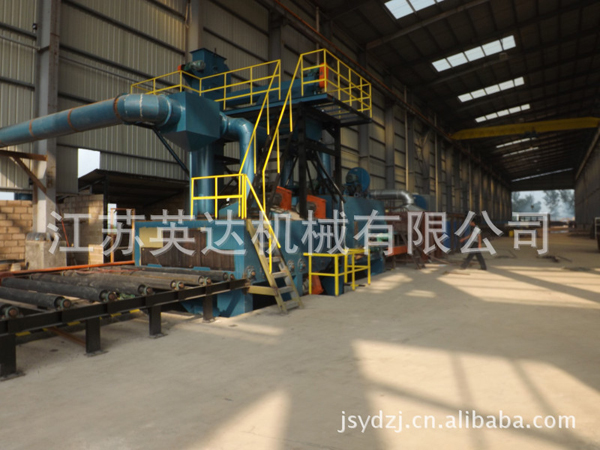 板材預(yù)處理線 型材預(yù)處理線為連續(xù)送料的高功能連續(xù)作業(yè)清理,在清理過程中由電氣控制的變頻電機驅(qū)動輥道將工件送進清理機室體內(nèi)拋射區(qū)時,其周身各面受到來自不同坐標方位的強力密集彈丸的打擊與磨擦,使工件上的氧化皮及其污物迅速脫落,工件表面獲得粗糙度的光潔表面。落入工件上面的彈丸與銹塵經(jīng)回收螺旋輸送到彈丸循環(huán)系統(tǒng),由清理室外兩邊裝卸工件。清理過程中,撒落下來的丸塵混合物經(jīng)室體漏斗、縱橫向螺旋輸送機匯集于提升機下部,再提升到機器上部的分離器里,分離后的純凈彈丸落入分離器料斗中,供拋丸循環(huán)使用。拋丸清理過程中產(chǎn)生的塵埃由抽風管送向除塵系統(tǒng),凈化處理后的凈氣排放到大氣中,顆粒狀塵埃被捕捉收集。